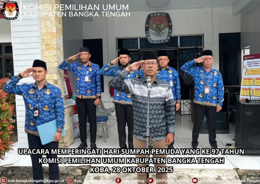 KPU Kabupaten Bangka Tengah melaksanakan Upacara Peringatan Hari Sumpah Pemuda ke-97 Tahun pada Selasa, 28 Oktober 2025 di Halaman Kantor KPU Kabupaten Bangka Tengah. Mengusung tema " Pemuda Pemudi Bergerak, Indonesia Bersatu", pembina Upacara oleh Anggota KPU Kabupaten Bangka Tengah, Bapak Sabpri Aryanto, serta secara khidmat diikuti oleh seluruh jajaran sekretatiat KPU Kabupaten Bangka Tengah. Selaras dengan tema perayaan sumpah pemuda yang ke-97 ini, dalam amanatnya Bapak Sabpri Aryanto menyampaikan semangat pemuda hendaknya terus menerus dikobarkan dalam pelaksanaan tugas-tugas kita bersama, dan tentunya keterlibatan peran pemuda dalam berdemokrasi tentu sangat dibutuhkan. Semoga peringatan sumpah pemuda ini menjadi momentum untuk memperkuat semangat persatuan serta mengokohkan komitmen bersama dalam membangun Indonesia. ....