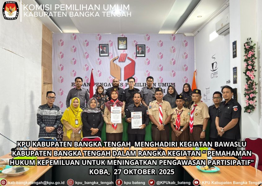 Kadiv Hukum Pengawasan KPU Kabupaten Bangka Tengah Bapak Patoni ikut serta menghadiri Kegiatan Bawaslu Kabupaten Bangka Tengah, dalam rangka kegiatan "Pemahaman Hukum Kepemiluan untuk Meningkatkan Pengawasan Partisipatif" yang dilaksanakan di Kantor Bawaslu Kabupaten Bangka Tengah (Senin, 27 Oktober/2025). Kegiatan ini dilaksanakan dalam rangka melakukan kajian hukum kepemiluan di wilayah Kabupaten Bangka Tengah yang akan dilaksanakan oleh Bawaslu Kabupaten Bangka Tengah dengan Tema " Pemahaman Hukum Kepemiluan untuk Meningkatkan Pengawasan Partisipatif" ....