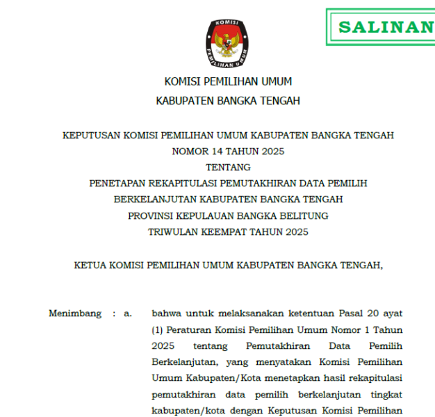 KEPUTUSAN KOMISI PEMILIHAN UMUM KABUPATEN BANGKA TENGAH NOMOR 14 TAHUN 2025 TENTANG PENETAPAN REKAPITULASI PEMUTAKHIRAN DATA PEMILIH BERKELANJUTAN KABUPATEN BANGKA TENGAH PROVINSI KEPULAUAN BANGKA BELITUNG TRIWULAN IV TAHUN 2025 downlad disini ....