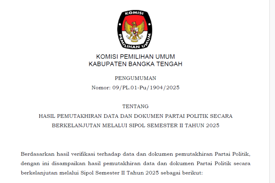 Berdasarkan hasil verifikasi terhadap data dan dokumen pemutakhiran Partai Politik, dengan ini disampaikan hasil pemutakhiran data dan dokumen Partai Politik secara berkelanjutan melalui Sipol Semester II Tahun 2025 DOWNLOAD ....