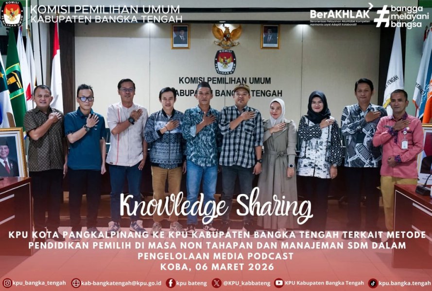 Koba, KPU Kabupaten Bangka Tengah menerima kedatangan KPU Kota Pangkalpinang dalam rangka Knowledge Sharing terkait dengan metode pendidikan pemilih di masa non tahapan dan manajeman SDM dalam pengelolaan media podcast (06 Maret 2026).