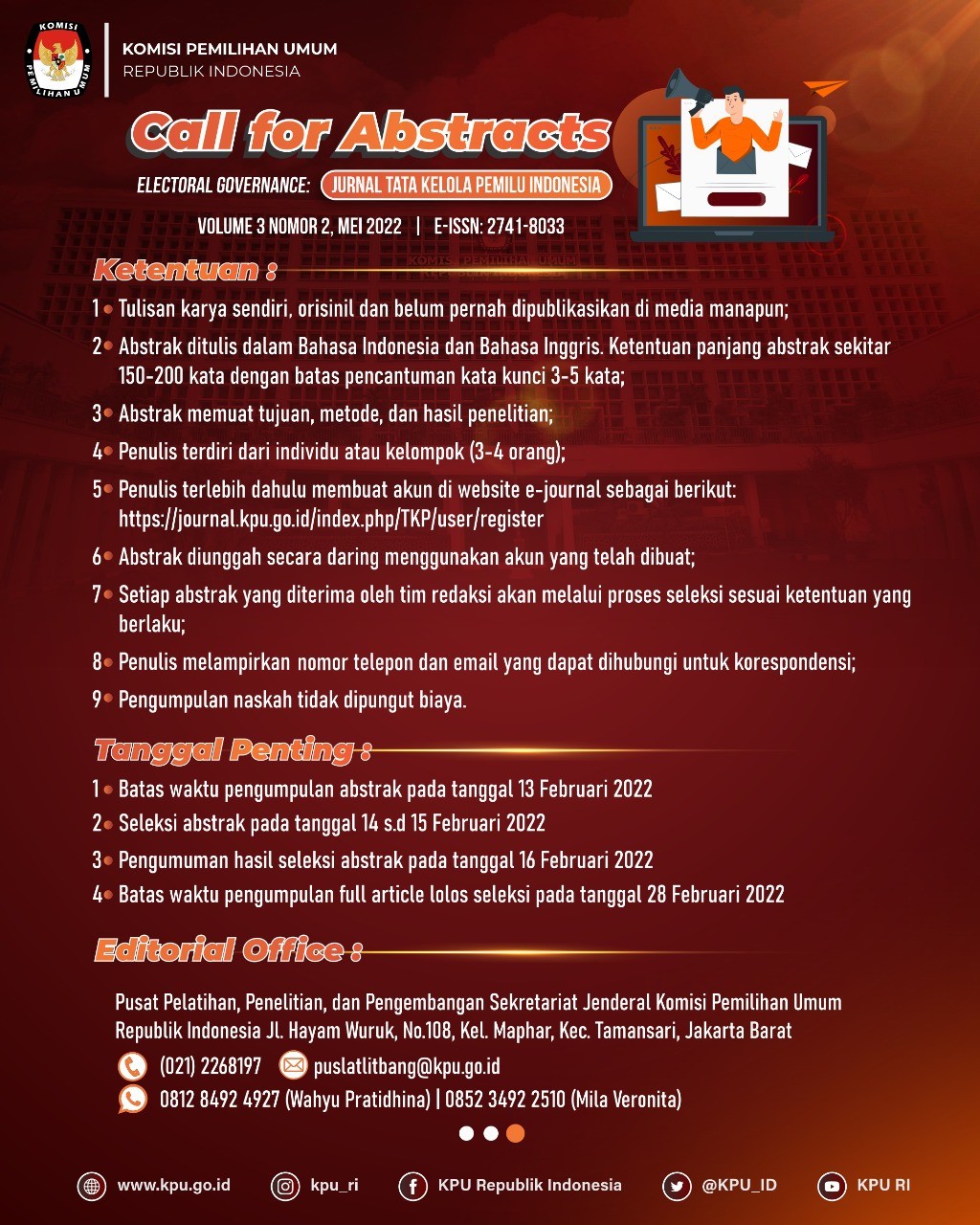 Komisi Pemilihan Umum Republik Indonesia (KPU RI) akan menerbitkan Electoral Governance: Jurnal Tata Kelola Pemilu Indonesia Volume 3 Nomor 2 Tahun 2022.