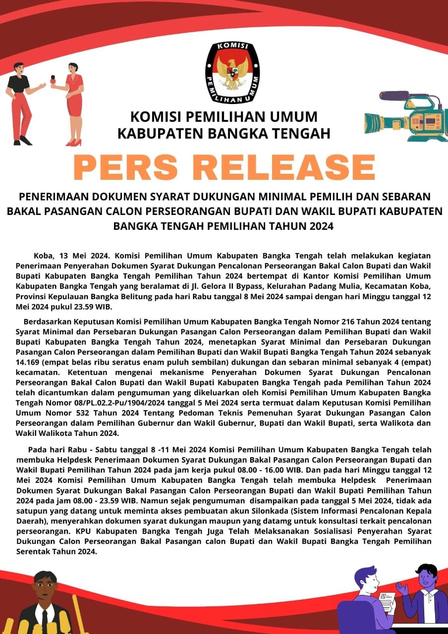 PERS RELEASE Penerimaan Dokumen Syarat Dukungan Minimal Pemilih dan Sebaran Bakal Pasangan Calon Perseorangan Bupati dan Wakil Bupati Kabupaten Bangka Tengah Tahun 2024