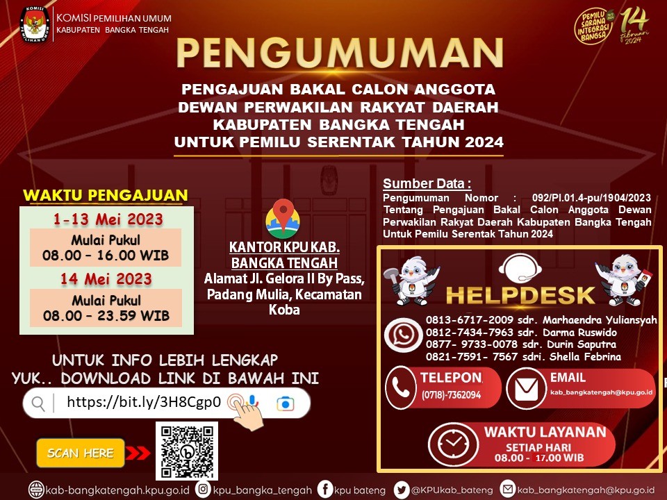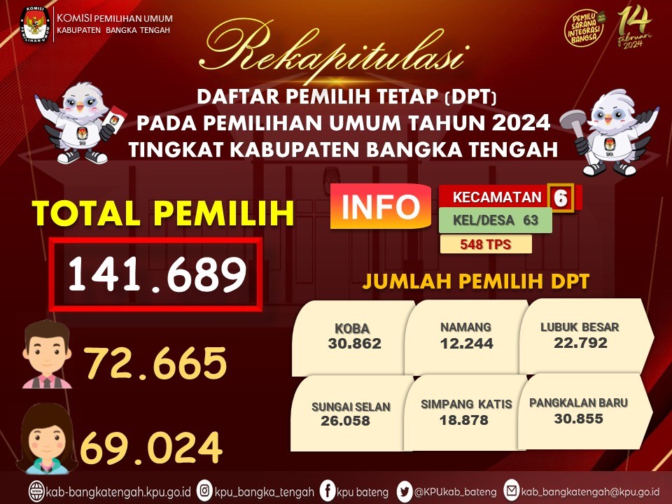 Koba- Komisi Pemilihan Umum (KPU) Kabupaten Bangka Tengah menggelar rapat pleno terbuka rekapitulasi daftar pemilih sementara hasil perbaikan (DPSHP) tingkat Kabupaten Bangka Tengah Pemilihan Umum Tahun 2024, bertempat di Aula Gedung Diklat Badan Kepegawaian dan Pengembangan Sumber Daya Manusia Daerah (BKPSDMD), Jum'at (12/05/2023) Berikut disampaikan hasil Rekapitulasi Daftar Pemilih Sementara (DPS) Tingkat Kabupaten Bangka Tengah dengan jumlah Pemilih aktif sebanyak 141.851 dengan rincian Jumlah Pemilih Laki-laki Sebanyak 72.761 dan Jumlah Pemilih Perempuan sebanyak 69.090. Kepada Seluruh Warga Bangka Tengah silahkan cek https://cekdptonline.kpu.go.id/ untuk mengecek Apakah sudah terdaftar sebagai Pemilih pada Pemilu Tahun 2024 nanti. Jika Belum silahkan untuk mengisi fomulir tanggap dan masukan masyarakat terhadap hasil Rekapitulasi Daftar Pemilih Sementara Hasil Perbaikan yang dapat di unduh pada link dibawah ini : https://docs.google.com/forms/d/e/1FAIpQLSeL3ACxETkT5yugx9noszsQy-jAw22SLBr-kKMLvr1yU7VtaA/viewform dan jika ada masukan atau tanggapan bapak/ibu dapat menyampaikan Kepada kami melalui : 1. mendatangi Kantor Sekretariat Panitia Pemunggutan Suara (PPS) di Setiap Kantor Desa/Kelurahan Dimasing-masing Kecamatan; 2. mendatangi Kantor Sekretariat Panitia Pemilihan Kecamatan (PPK) Di Se-Kabupaten Bangka Tengah 3. mendatangi Kantor KPU Kabupaten Bangka Tengah yang beralamat di jalan Gelora 2 Bypass Koba, Komplek Perkantoran dan Pemukiman Terpadu Pemerintah Kabupaten Bangka Tengah 4. atau dapat mengirimkan E-mail Ke data.kpubateng@gmail.com kepada bapak/ibu yang memberikan masukan atau tanggapan jangan lupa untuk melampirkan bukti foto copy KTP dan Foto copy Kartu Keluarga.