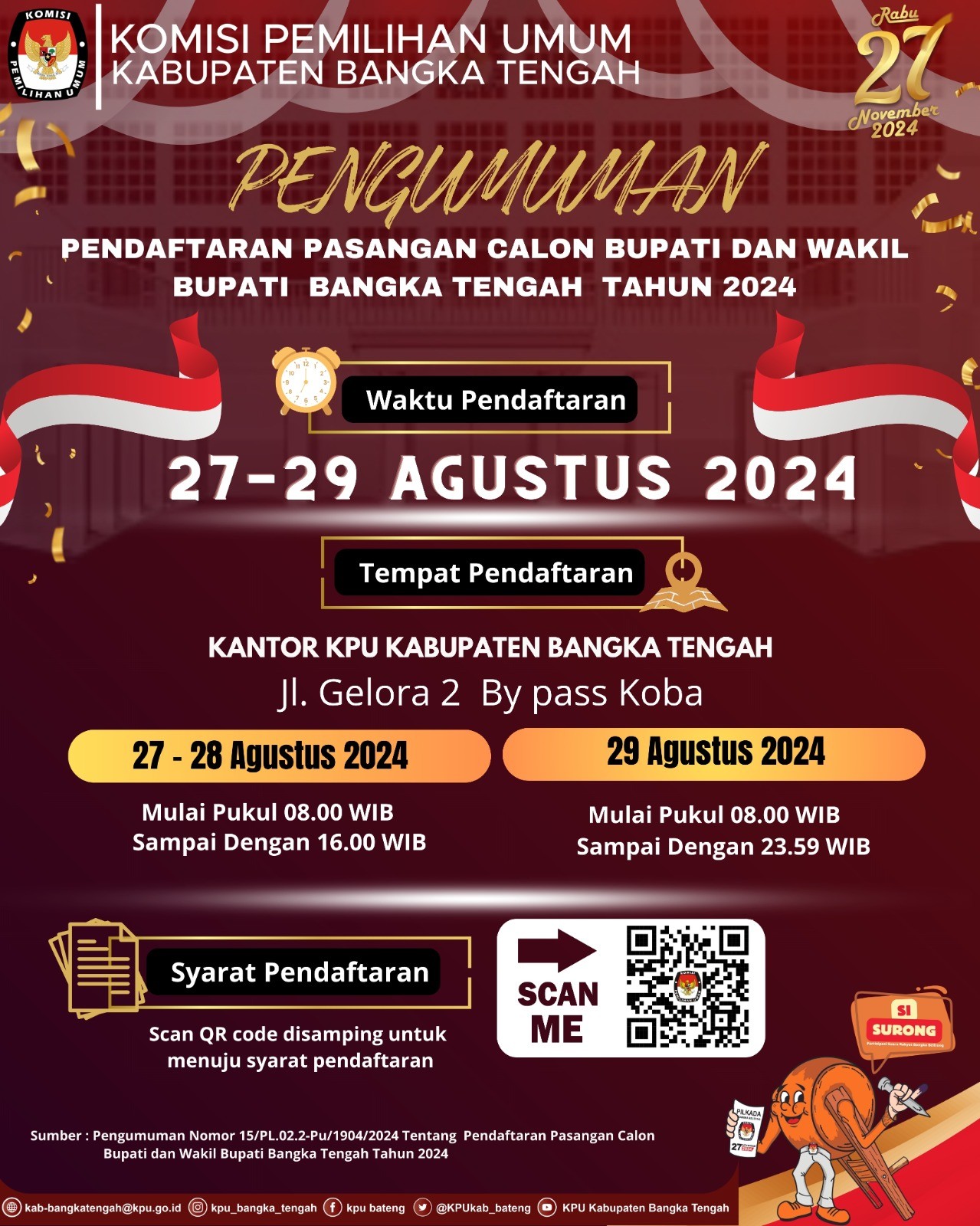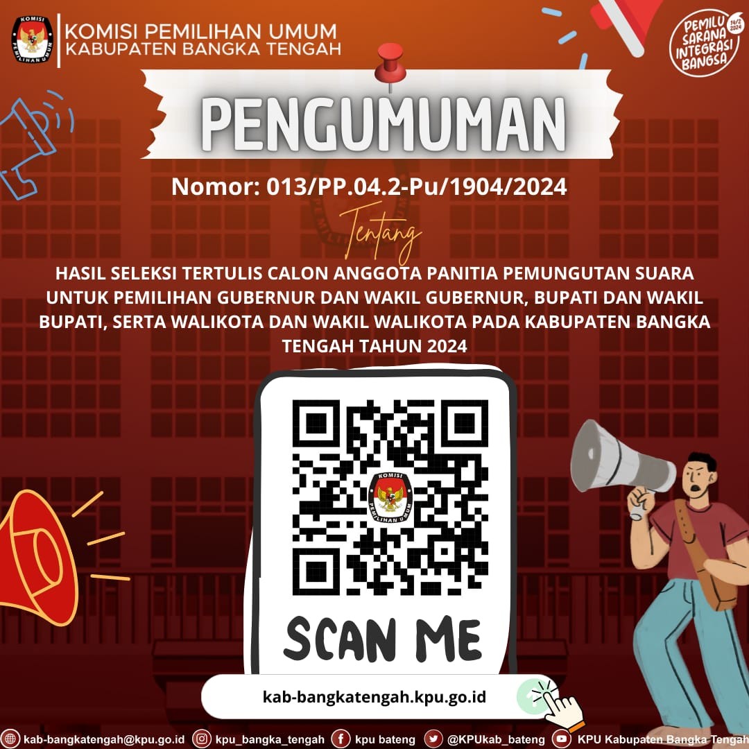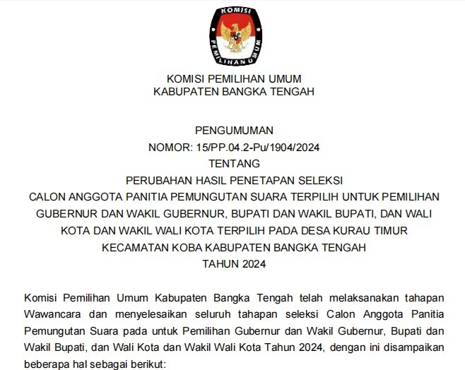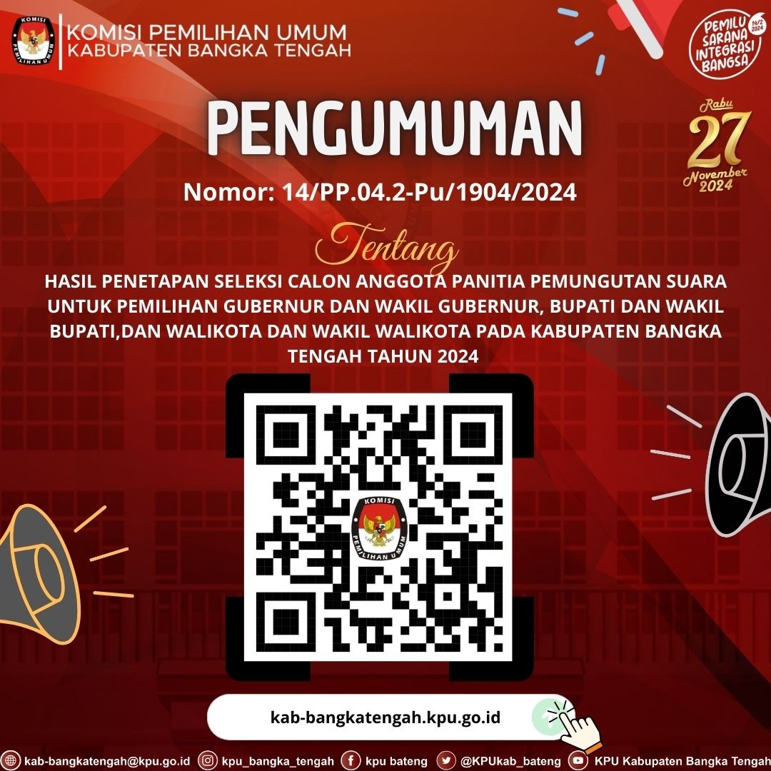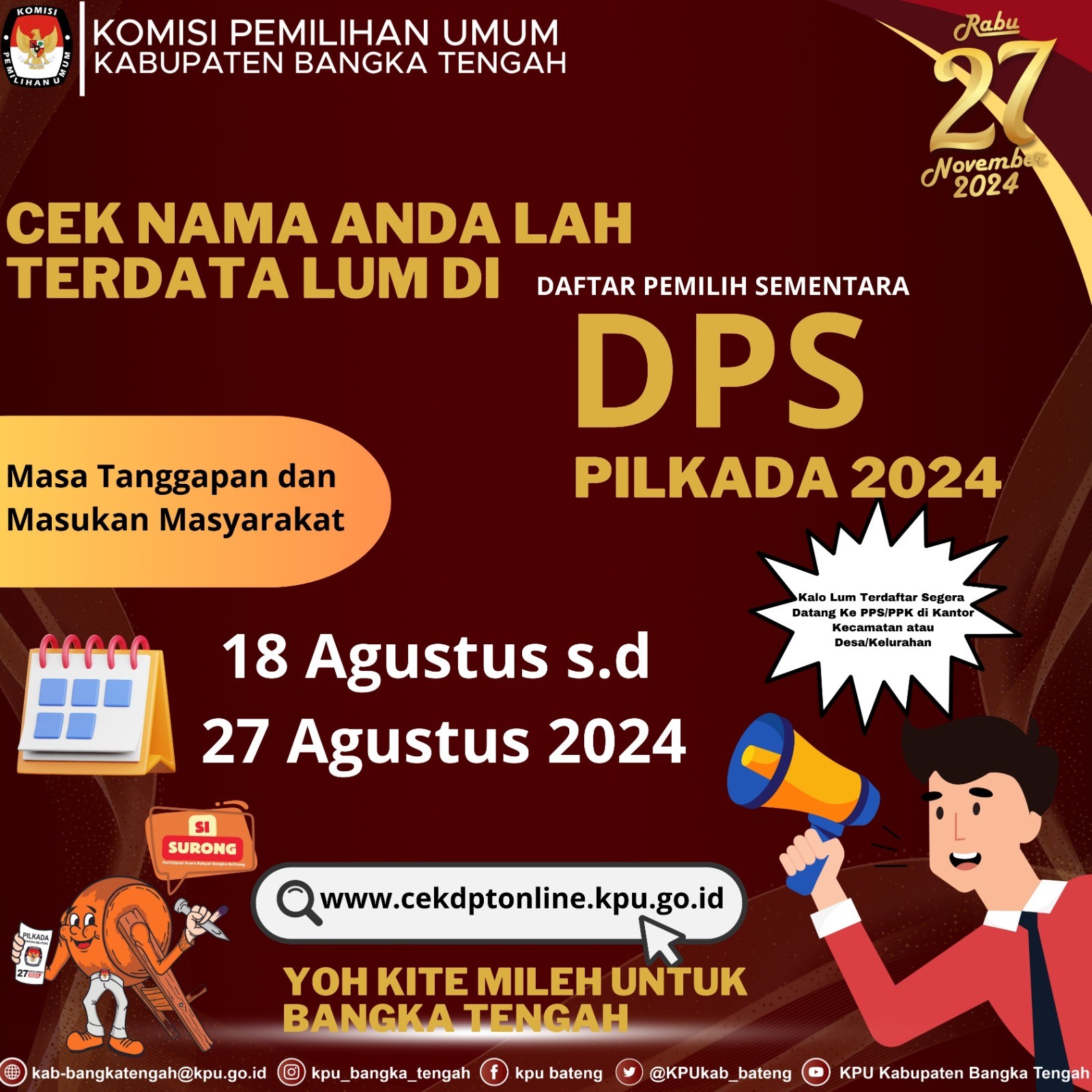 #TemanPemilih Berikut disampaikan Keputusan KPU Kabupaten Bangka Tengah Tentang Penetapan Rekapitulasi Daftar Pemilih Sementara Tingkat Kabupaten Bangka Tengah Pemilihan Gubernur dan Wakil Gubernur, dan Bupati dan Wakil Bupati Tahun 2024. Download Disini